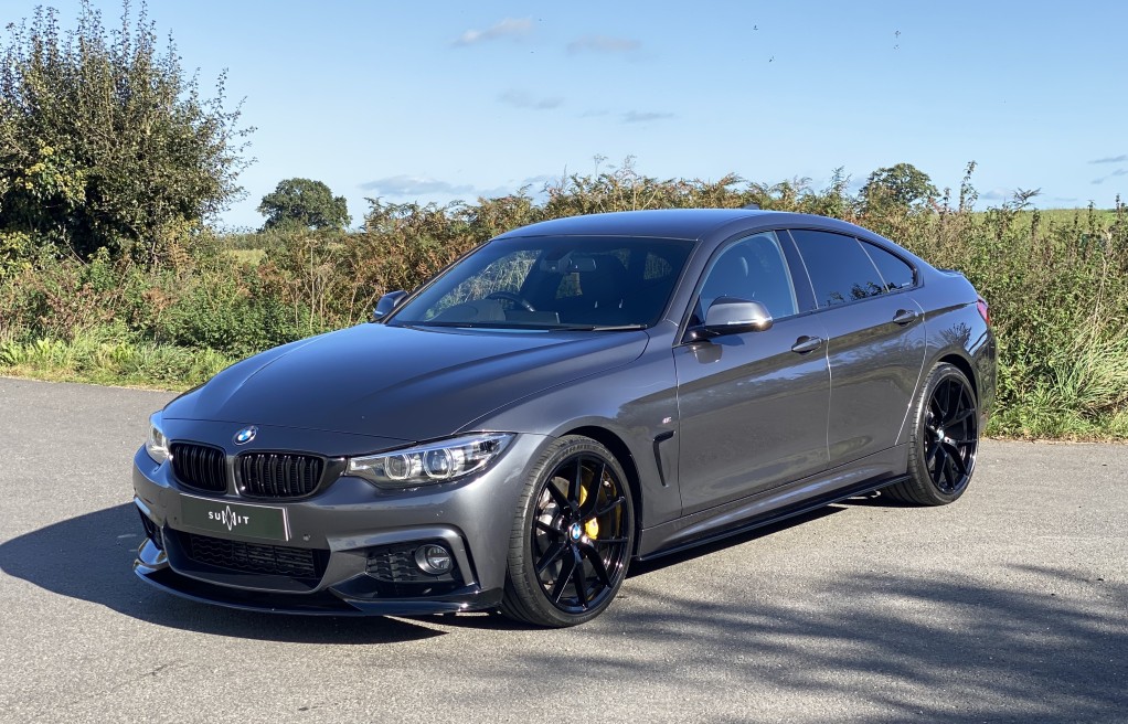 We are delighted to offer this exceptional, BMW 430d Msport gran coupe, finished in "Mineral Grey" exterior paint, complimented by full black leather interior. This vehicle has an impressive list of optional extras, totalling an original factory cost of £5,375, some of which include... Comfort access package (keyless entry and keyless start), Msport plus package (consisting of Harmon Kardon HiFi, Sun protection glass and upgraded Msport braking system), Comfort package, Extended storage package, High beam assist, and Electric Folding exterior mirrors to mention just a few (please see full specification below). In addition to the large factory specification, it also comes with BMW 763M 20" Mperformance alloy wheels, BMW Mperformance style full bodykit in high gloss black, Mperformance style boot lip spoiler andYellow brake callipers (instead of standard Estoril blue). Finally, it comes with 2 digital keys, and full previous BMW service history, the service history entries are as follows..