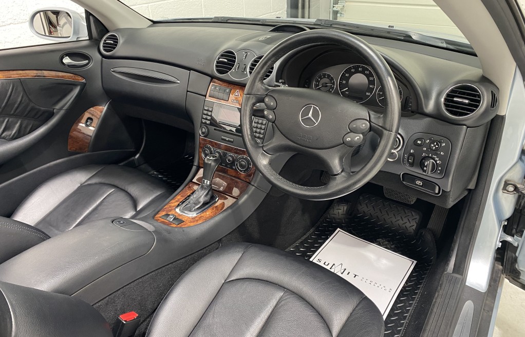 Inside the car the excellent condition reflects the low mileage. The leather seats are like new, the carpets are unmarked and the wood inserts in the dash and doors are glossy and smooth with no marks and the ruched leather door cards are superb. The power hood raises and lowers just as it should with a push of the button and the four electric windows work correctly. This CLK also has power fold mirrors, auto dipping lights, dual zone climate and cruise control among other features.