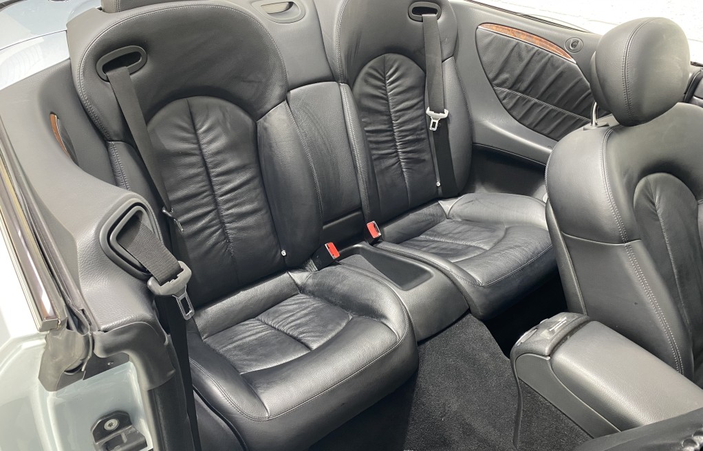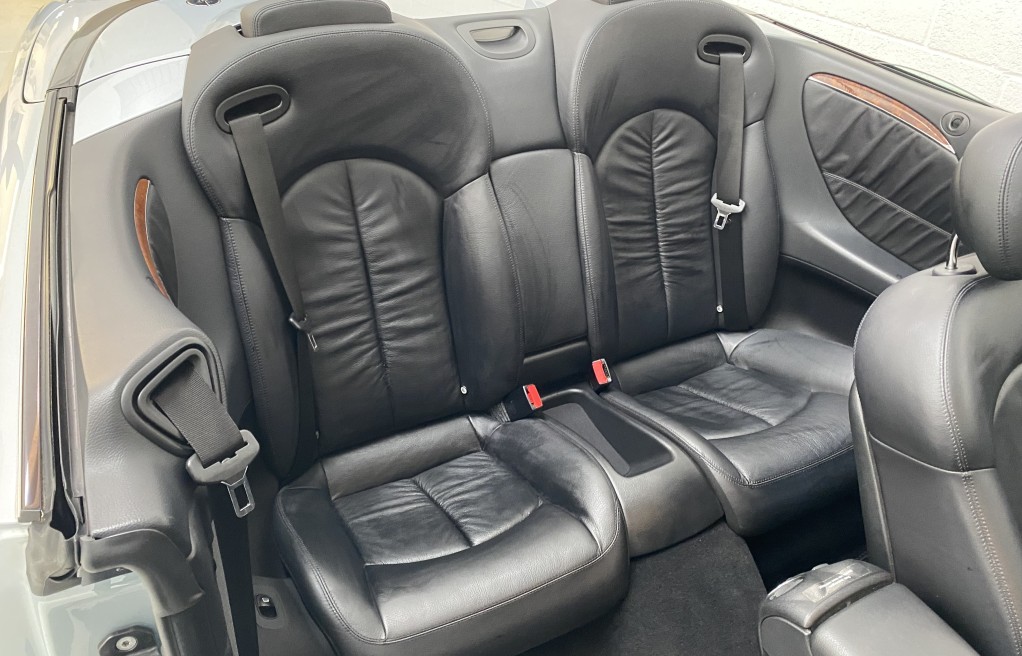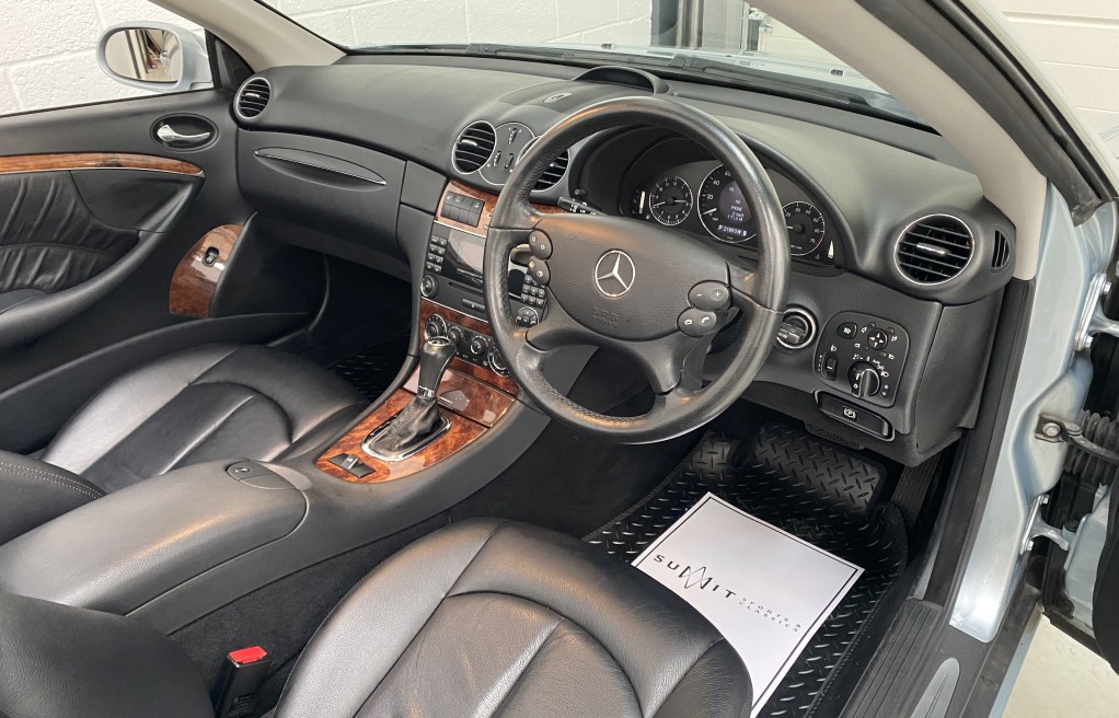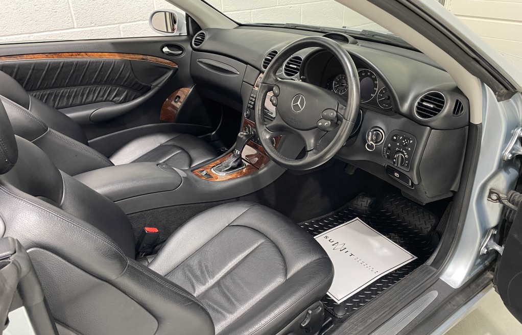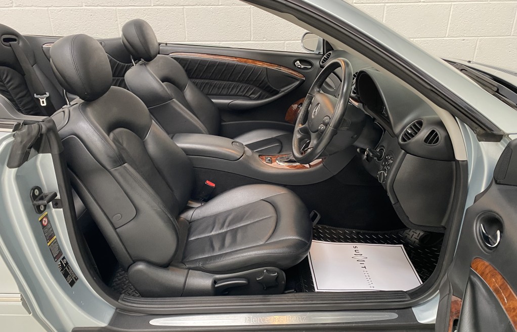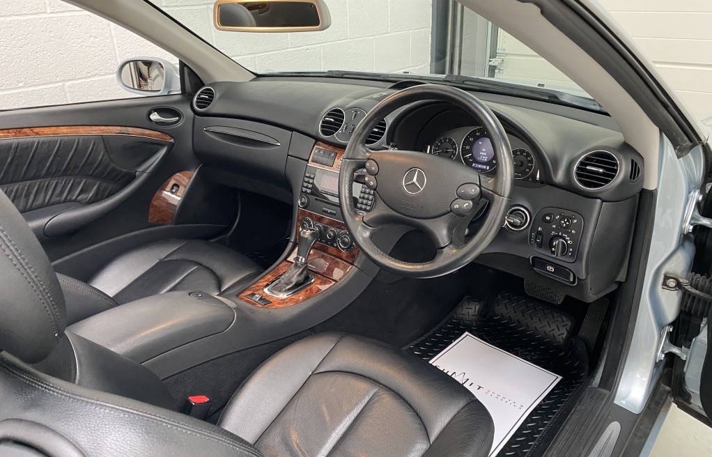 Inside the car the excellent condition reflects the low mileage. The leather seats are like new, the carpets are unmarked and the wood inserts in the dash and doors are glossy and smooth with no marks and the ruched leather door cards are superb. The power hood raises and lowers just as it should with a push of the button and the four electric windows work correctly. This CLK also has power fold mirrors, auto dipping lights, dual zone climate and cruise control among other features.